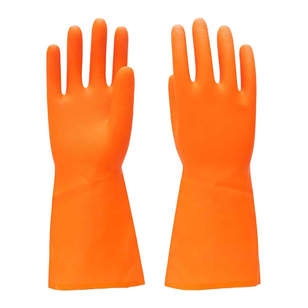 HF2813-ORN Heavy Duty Flocklined Natural Rubber Gloves are perfect for use in agriculture, chemical handling, sand blasting, and heavy equipment assembly, providing reliable protection and performance in demanding environments.